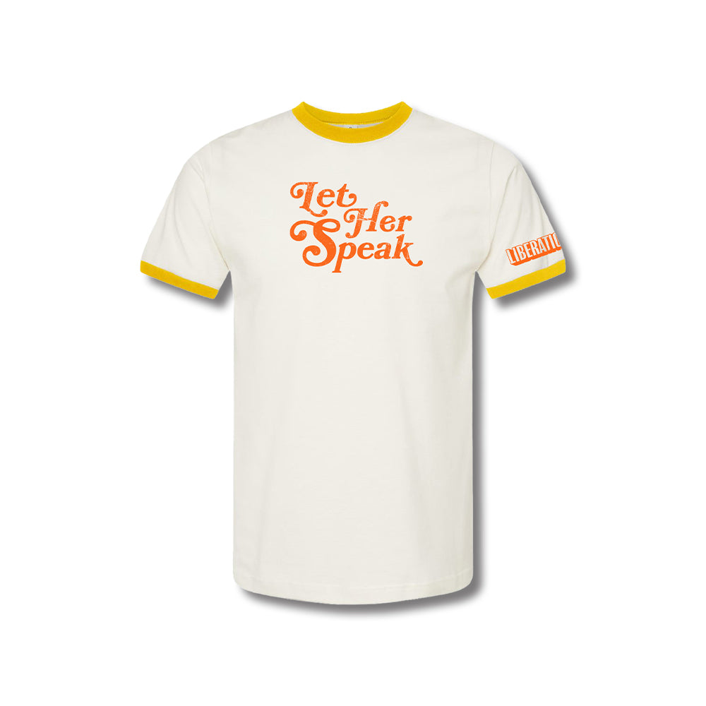 Never be interrupted with this ringer-style tee featuring the quote, "Let her speak," on the front, and the Liberation logo on the left sleeve.