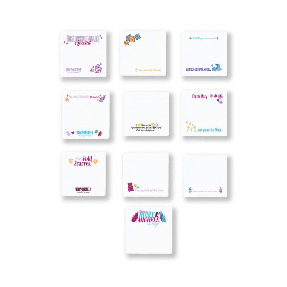 Display this sticky note pad featuring iconic moments from Romy and Michele: The Musical with pride. You did invent them after all.