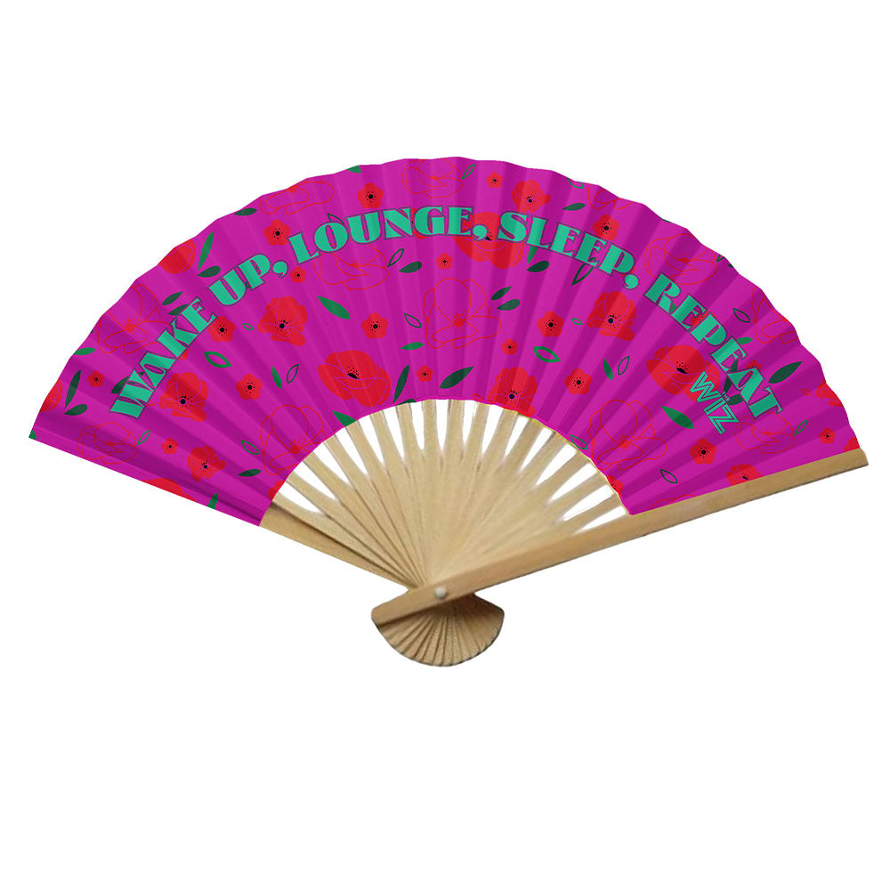 Keep it cool with this The Wiz hand fan with the playful mantra "Wake Up, Lounge, Sleep, Repeat" printed across the front.